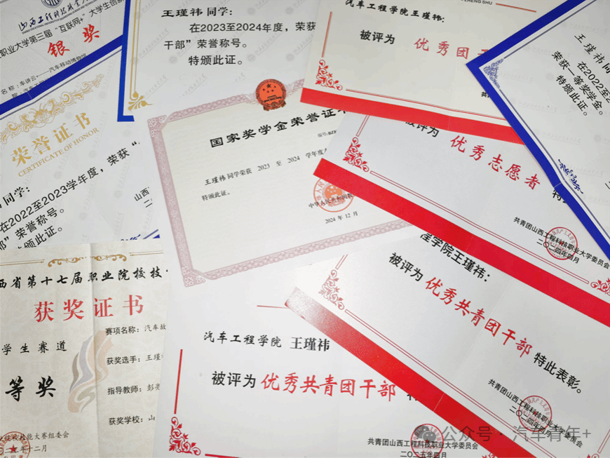 王瑾祎积极投身各类比赛和活动,全力以赴挑战自我。在山西工程科技职业大学第三届“互联网+”大学生创新创业大赛中,他与团队成员紧密合作,充分发挥各自优势,从项目构思、策划到实施,投入大量时间和精力,不断进行市场调研、分析用户需求、完善项目方案,最终项目在众多参赛作品中脱颖而出,获得校赛银奖。此外,他还荣获山西省第十七届职业院校技能大赛汽车故障检修一等奖,并成功获得4项计算机软件著作权授权。这些经历让他深刻体会到创新和团队合作的重要性。