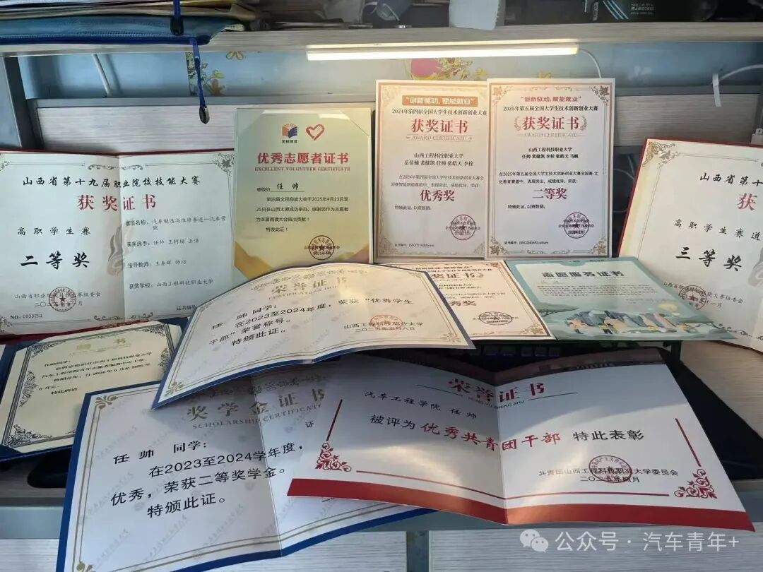 2024 - 2025年期间,任帅两次入选学院特色专业技能大赛集训队,全身心投入备赛。在省级赛场,他沉稳应战,先后在连续两届省级汽车营销大赛中脱颖而出,斩获省级二等奖与省级三等奖。在全国赛事舞台上,他同样表现亮眼,在2024年第四届全国大学生技术创新创业大赛全国赛智能制造赛道中荣获优秀奖,2025年又在第五届全国大学生技术创新创业大赛全国赛文化教育赛道中斩获二等奖。此外,在山西省第十九届职业院校技能大赛高职学生赛道中,他与团队成员携手奋进,在指导教师的带领下拿下二等奖,用一张张获奖证书印证了自己的专业实力。