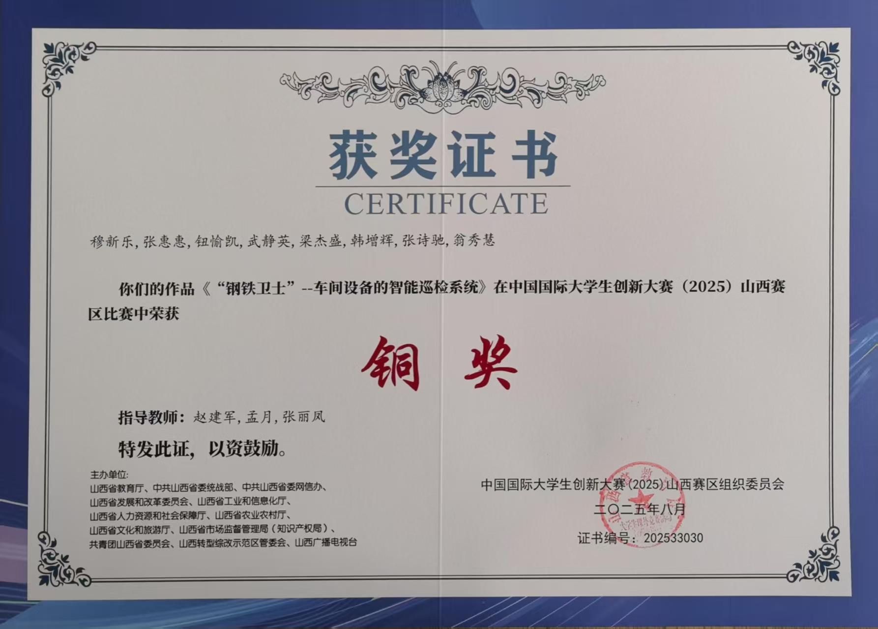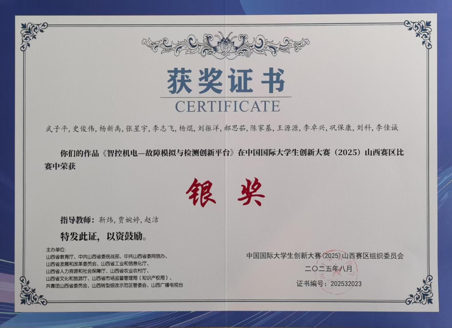 其中,由靳炜、贾婉婷、赵洁老师指导,武子平,史俊伟,杨新禹,张星字,李志飞,杨焜等同学组成的团队,凭借作品《智控机电一故障模拟与检测创新平台》,荣获大赛银奖;由赵建军,孟月,张丽凤老师指导,穆新乐,张惠惠,钮愉凯,武静英等同学完成的《“钢铁卫士”--车间设备的智能巡检系统)》项目,斩获铜奖。